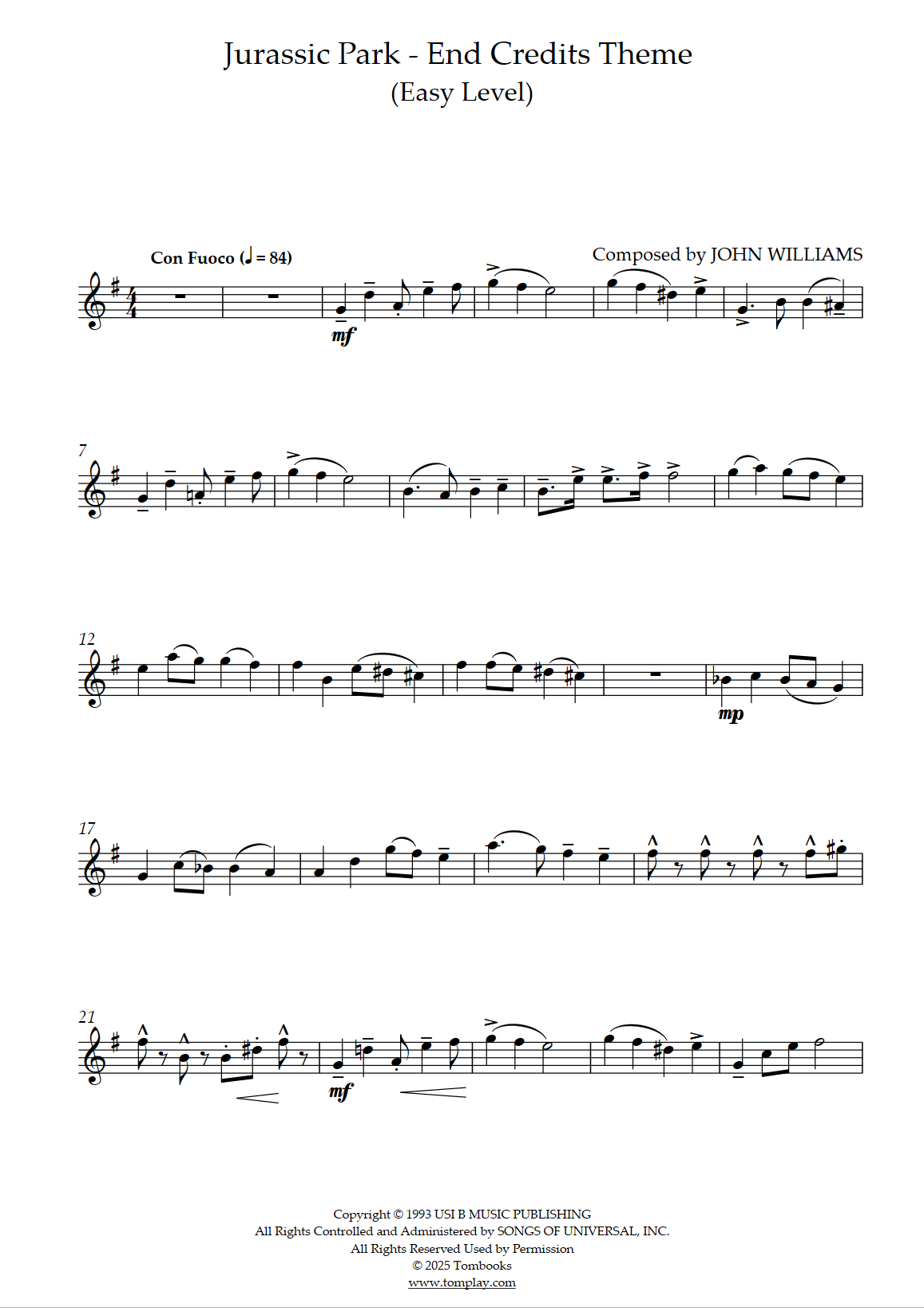 John Williams : Jurassic Park - Thème End Credits (niveau facile, sax ténor)