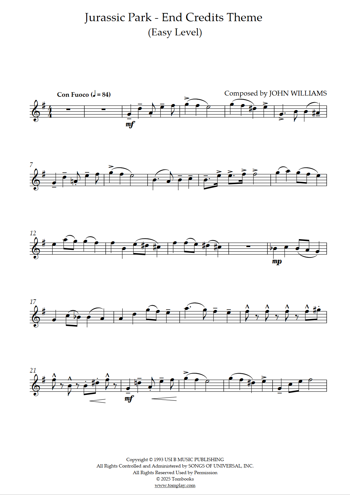 John Williams : Jurassic Park - Thème End Credits (niveau facile, sax soprano)