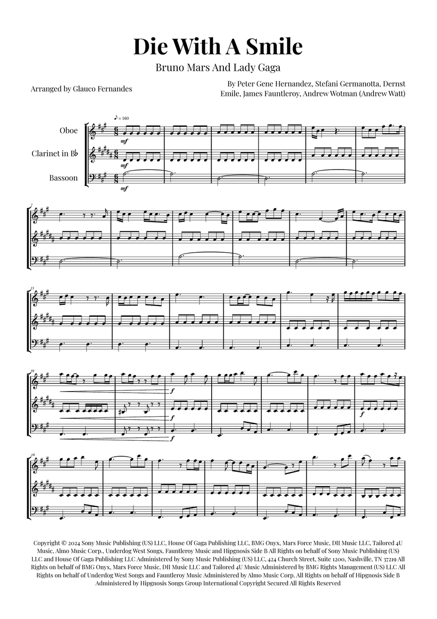 Instrumental Duet,Piano Instrumental Duet,Piano,Viola,Violin - Level 3 - Digital Download SKU: A0.1510686 By Bruno Mars And Lady Gaga. By Andrew Wotman (Andrew Watt), Dernst Emile, James Fauntleroy, Peter Gene Hernandez, and Stefani Germanotta. Arranged by Glauco Fernandes. Chamber,Pop,Rock,Wedding. 10 pages. Glauco Fernandes #1085886. Published by Glauco Fernandes (A0.1510686). Explore the sheet music for Die With A Smile by Lady Gaga and Bruno Mars. Perfect for musicians who want to play this powerful song. Get the sheet music for Die With A Smile and add this collaboration by Lady Gaga and Bruno Mars to your repertoire. This sheet music for Die With A Smile is ideal for anyone looking to master this unique song.Purchase the sheet music for Die With A Smile by Lady Gaga and Bruno Mars today. Download the sheet music for Die With A Smile and start practicing now.Tags: Die With A Smile, Lady Gaga, Bruno Mars, sheet music, music download, learn Die With A Smile, buy sheet music, popular music.