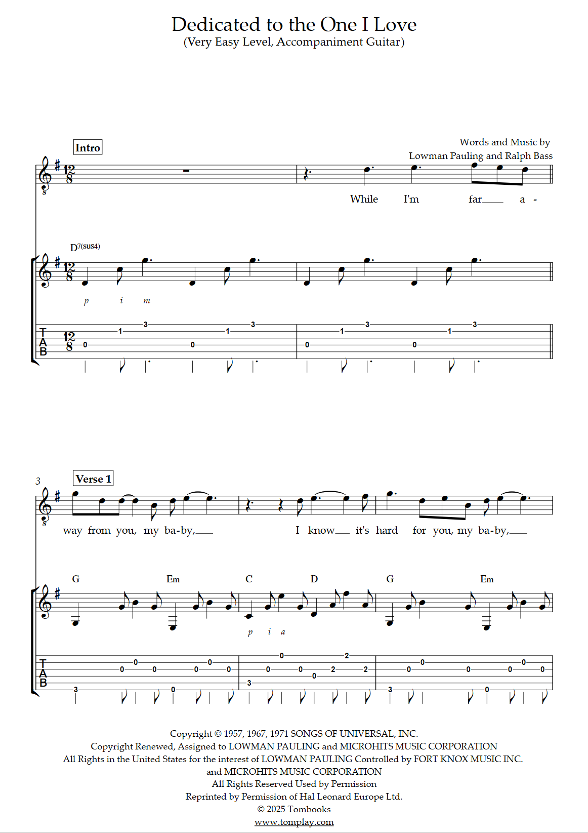 Téléchargez la tablature et la partition Guitare Dedicated to the One I Love (niveau très …