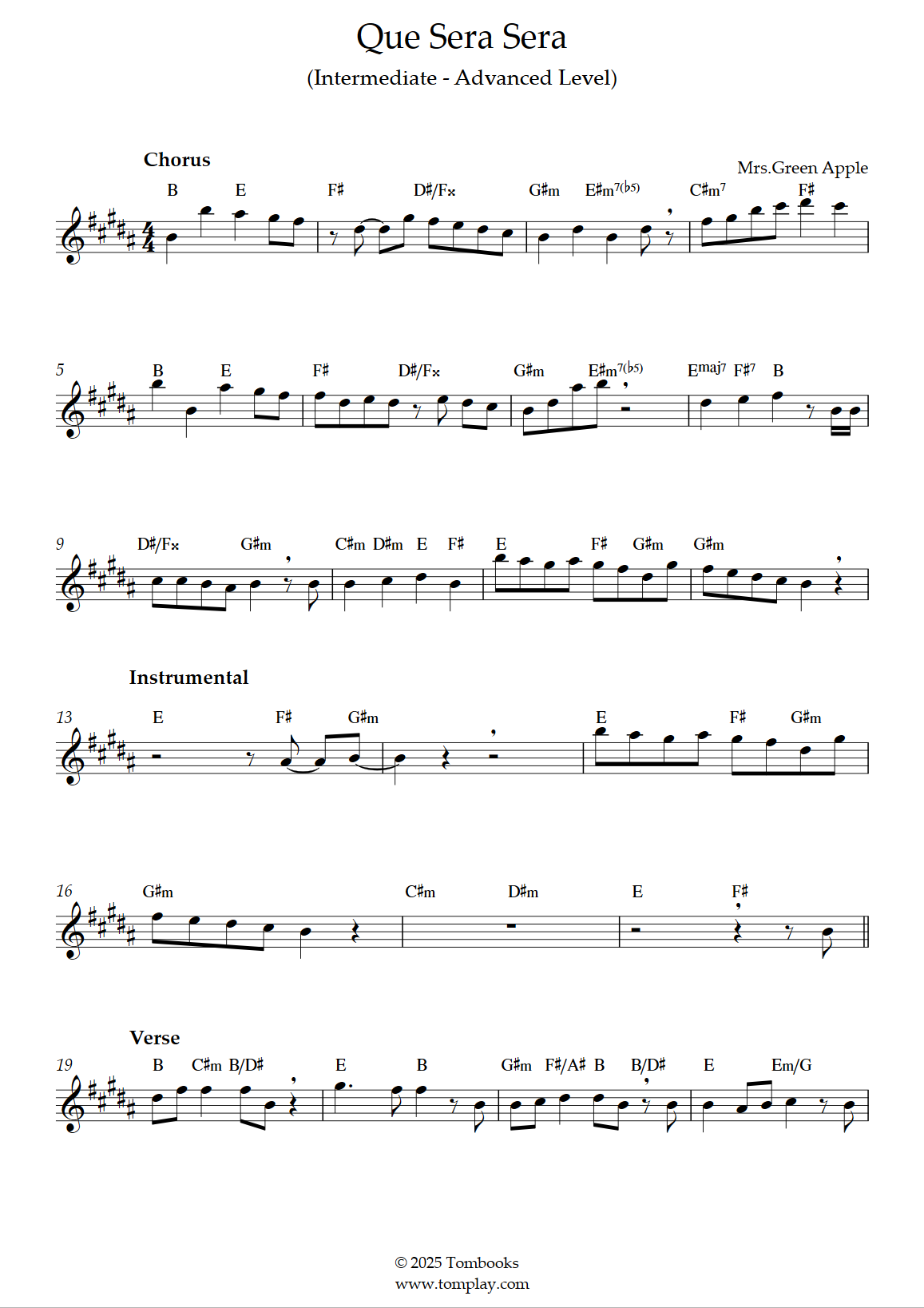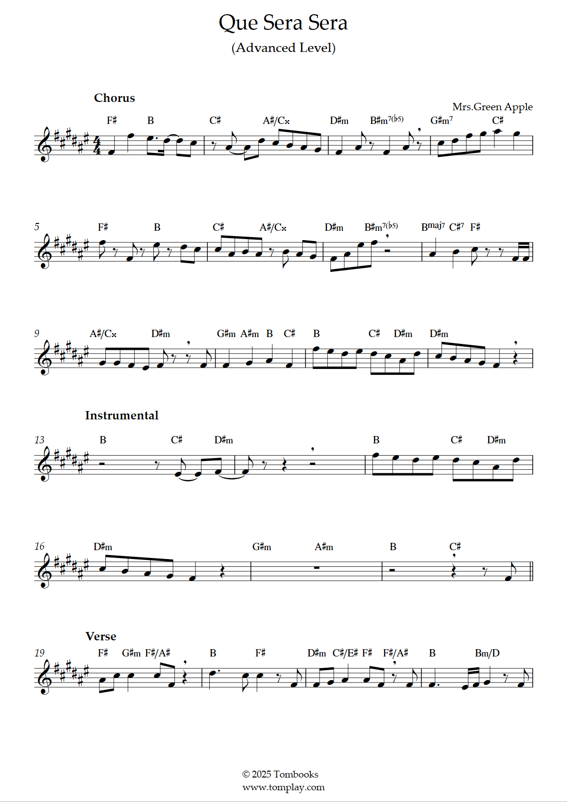 Mrs. Green Apple : Que Sera Sera (niveau difficile, sax alto)
