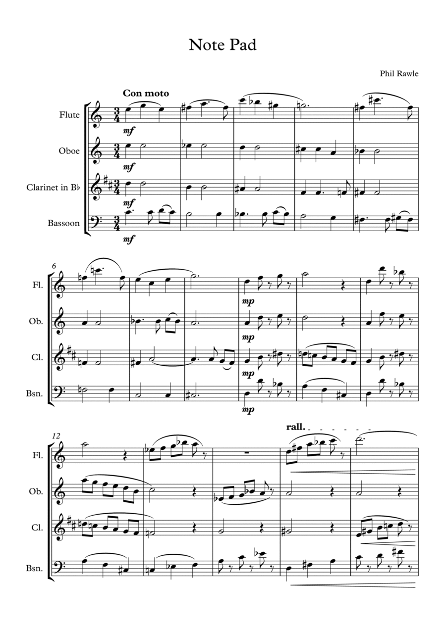 Saxophone Quartet,Woodwind Ensemble Alto Saxophone,Baritone Saxophone,Soprano Saxophone,Tenor Saxophone - Level 3 - Digital Download SKU: A0.1380730 Composed by Phil Rawle. Classical,Contemporary,Traditional. 15 pages. Phillip Rawle #965513. Published by Phillip Rawle (A0.1380730). A happy, spritely piece played at pace with a slower, reflective mood in the middle.Arranged for Saxophone Quartet - Soprano, Alto. Tenor, Baritone.Not too difficult.
