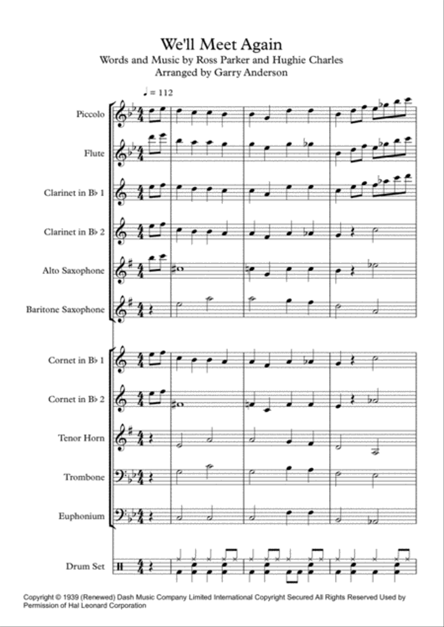 Large Ensemble Alto Saxophone,Cello,Clarinet,Descant Recorder,Double Bass,Euphonium,Flute,Guitar,Piano Accompaniment,Tenor Recorder,Tenor Saxophone,Trombone,Trumpet,Tuba,Ukulele,Viola,Violin,Voice - Level 1 - Digital Download SKU: A0.842448 Composed by Hughie Charles and Ross Parker. Arranged by Tony Tournoff. Opera. Score and parts. 31 pages. Fairways Music #5197067. Published by Fairways Music (A0.842448). This arrangement is to be used to celebrate the 75th Anniversary of VE Day.