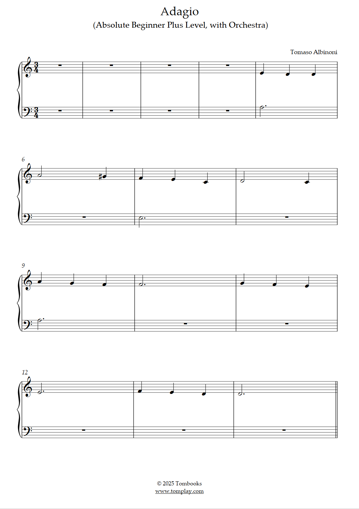 Téléchargez la partition Piano Adagio (niveau débutant plus, avec orchestre) de Albinoni. …
