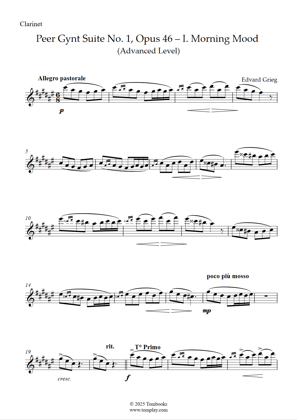 Téléchargez la partition Clarinette Suite de Peer Gynt n° 1, Opus 46 – I. Au matin (niveau…