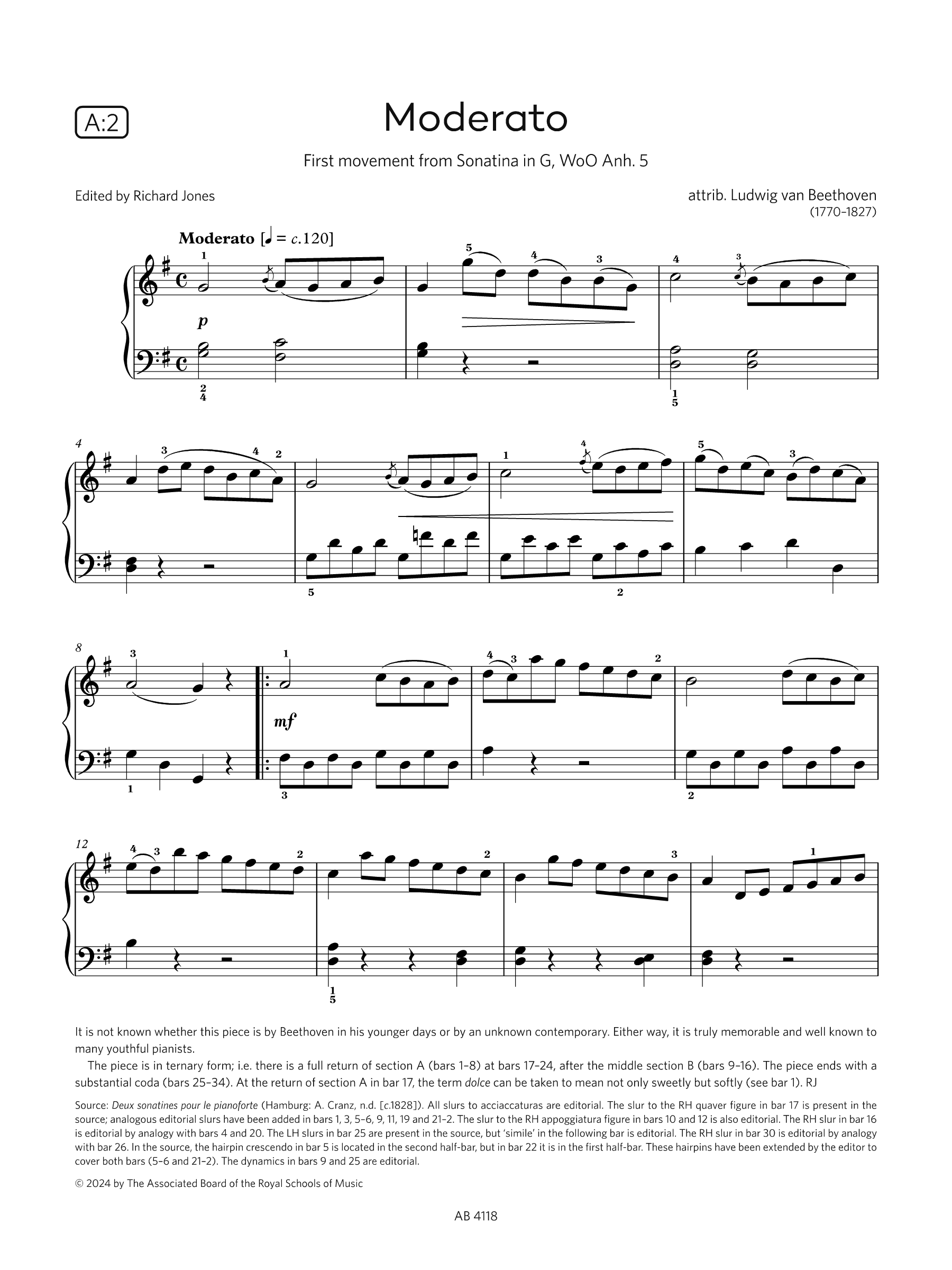 Beethoven : Moderato (1st movt from Sonatina in G, Anh. 5/1) (ABRSM Piano Exams from 2025 & 2026, Grade 2, A:2)