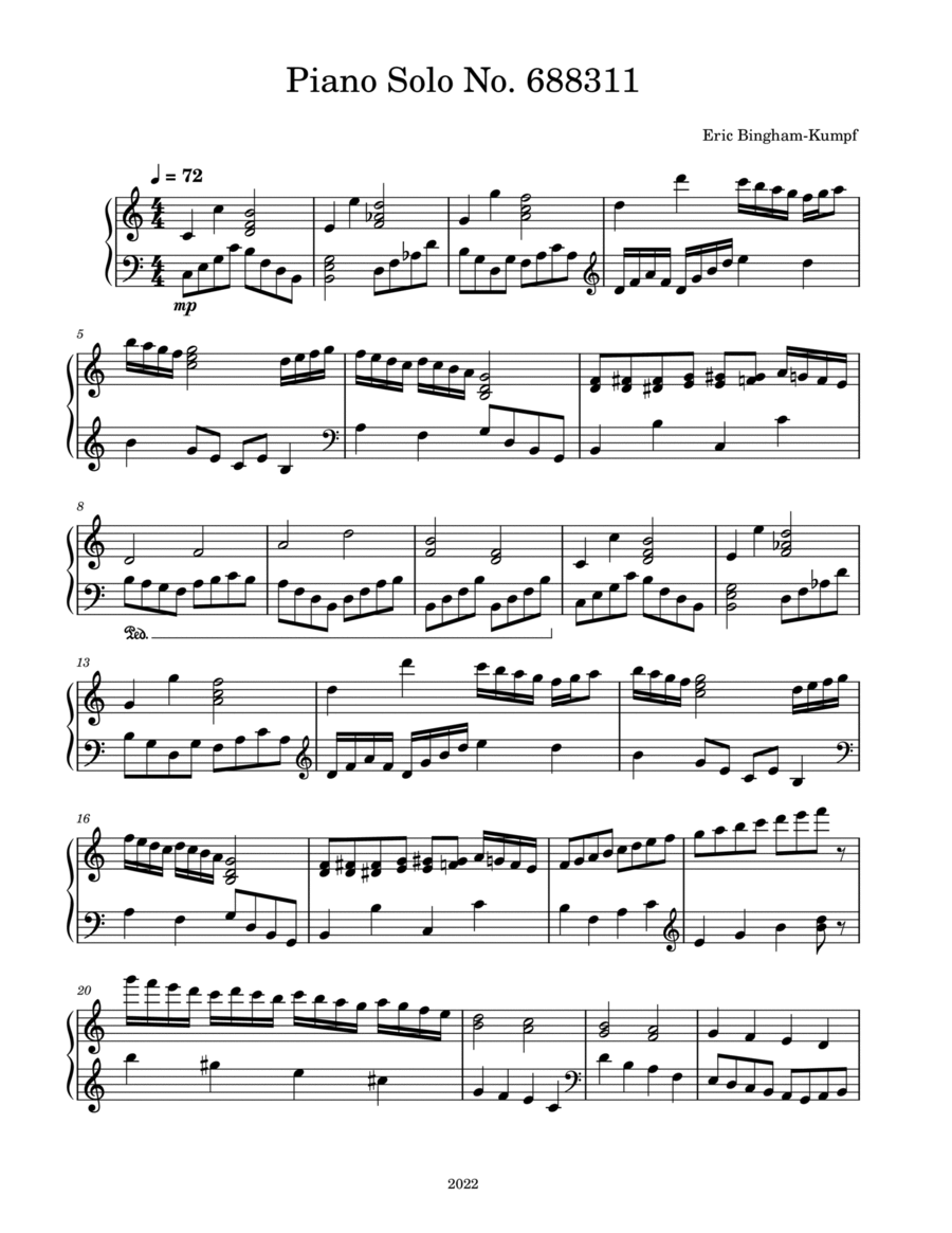 Piano Solo - Level 2 - Digital Download SKU: A0.1169318 Composed by Sibylle Kuder. Classical,Contest,Festival,Instructional,Traditional. Score. 4 pages. Sibylle Kuder #769671. Published by Sibylle Kuder (A0.1169318). Flowing, not fast, with a gentle touch, in 6/8 time.Key of A major with a few brief modulations to E major. One-octave arpeggios, up and down, mostly in the left hand, in the keys of D major, A major, E major, and B major (twice), one at a time, with plenty of time to shift / move the hand. Always in root position which means the fingering is always the same. It also means that you don't need to read any notes beyond the first note of each arpeggio. No accidentals other than D#'s. Almost continuous eighth note motion, with few interruptions, should make the counting easy. This is a good exercise for wrist rotation and for developing a beautiful tone as well as evenness of touch. Four pages, Level 3.