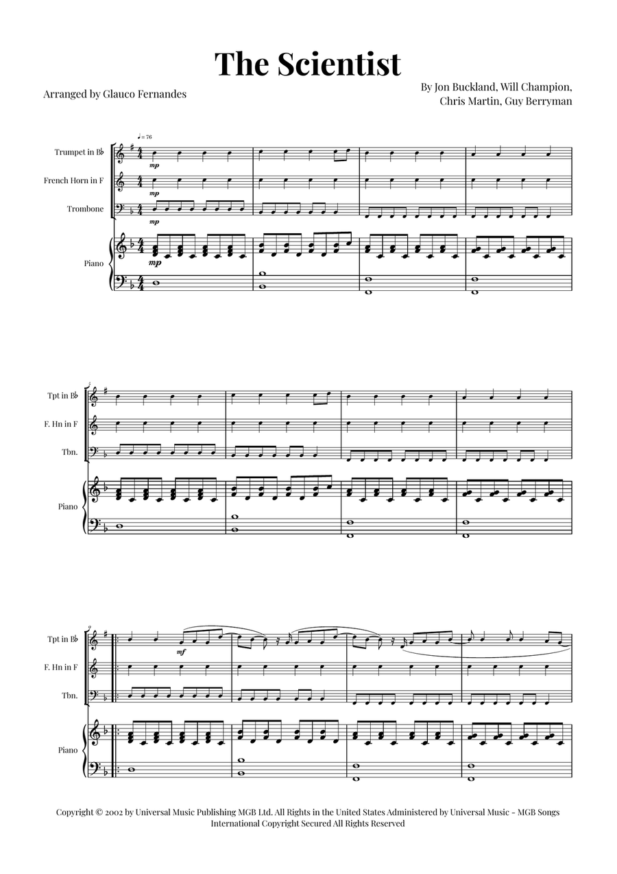 Saxophone Quintet,Woodwind Ensemble Alto Saxophone,Baritone Saxophone,Soprano Saxophone,Tenor Saxophone - Level 2 - Digital Download SKU: A0.1474938 By Coldplay. By Chris Martin, Guy Berryman, Jon Buckland, and Will Champion. Arranged by Glauco Fernandes. 21st Century,Chamber,Pop,Rock,Wedding. 12 pages. Glauco Fernandes #1052403. Published by Glauco Fernandes (A0.1474938). The Scientist, by Coldplay, is a timeless piece that deeply resonates with audiences. This arrangement has been meticulously crafted for easy listening, making it ideal for professionals seeking simplicity with professionalism, students, and teachers. Perfect for weddings, this arrangement brings a soft and emotional touch to your performances. Get your sheet music now and enhance your performances and lessons with this modern classic.Tags: Coldplay, The Scientist, piano, sheet music, arrangement, easy listening, classical music, event, wedding, music lesson, music student.