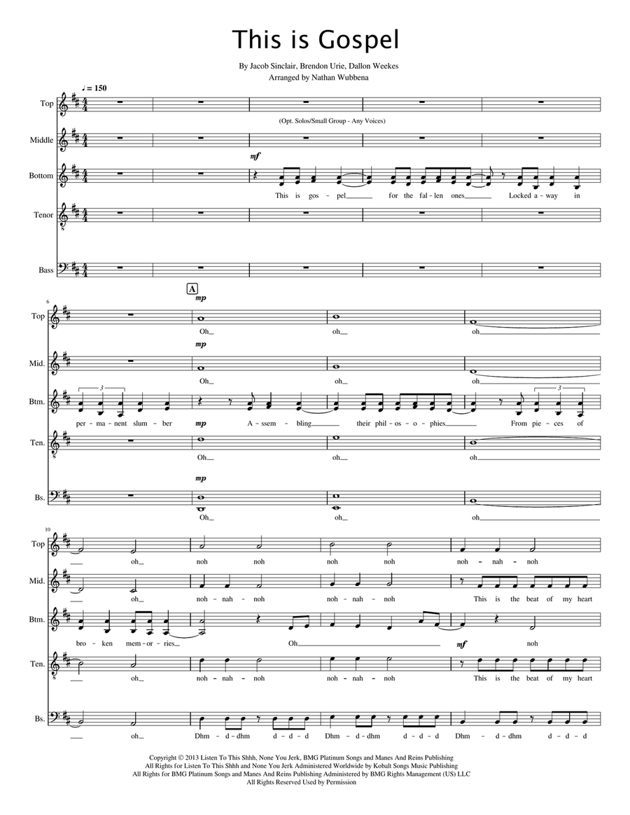 Choral Choir (SATB divisi) - Level 3 - Digital Download SKU: A0.896595 By Panic! At the Disco. By Brendon Urie, Dallon Weekes, and Jacob Sinclair. Arranged by Nathan Wubbena. A Cappella,Pop,Punk. Octavo. 9 pages. Nathan Lawrence Wubbena #5043839. Published by Nathan Lawrence Wubbena (A0.896595). This is Gospel by Panic! at the Disco (P!atD) arranged for SSATB, a cappella by Nathan WubbenaPurchase of one copy grants rights to make and distribute copies for your whole ensemble.Appropriate for any level of ensemble: middle school, high school, adult.Rehearsal tracks available: please contact Nathan Wubbena directly: https://nathanwubbena.weebly.com/Purchase Nathan Wubbena's arrangements at SMPPress: https://www.sheetmusicplus.com/search?Ntt=nathan+wubbena