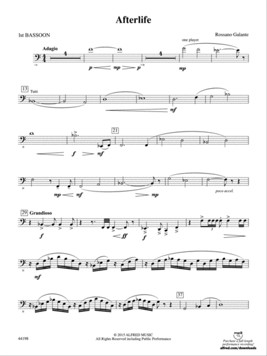 Concert Band - Digital Download SKU: AX.00-PC-0017048_B1 Bassoon. Composed by Rossano Galante. Instructional. Part. 2 pages. Alfred Music - Digital Sheet Music #00-PC-0017048_B1. Published by Alfred Music - Digital Sheet Music (AX.00-PC-0017048_B1). UPC: 038081498171.Since the beginning of time man has pondered what happens when our physical body dies. Some believe we go to Heaven. Others doubt its existence entirely. Then there are those who have had near death experiences and live to tell their stories. This composition starts delicately as peacefulness returns to the soul. It intensifies as we approach our new consciousness, constantly modulating between the two as we gain knowledge of our new surroundings. (4:45)Concert/Contest; Festival.