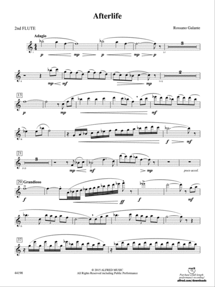 Concert Band - Digital Download SKU: AX.00-PC-0017048_F2 2nd Flute. Composed by Rossano Galante. Instructional. Part. 2 pages. Alfred Music - Digital Sheet Music #00-PC-0017048_F2. Published by Alfred Music - Digital Sheet Music (AX.00-PC-0017048_F2). UPC: 038081498171.Since the beginning of time man has pondered what happens when our physical body dies. Some believe we go to Heaven. Others doubt its existence entirely. Then there are those who have had near death experiences and live to tell their stories. This composition starts delicately as peacefulness returns to the soul. It intensifies as we approach our new consciousness, constantly modulating between the two as we gain knowledge of our new surroundings. (4:45)Concert/Contest; Festival.