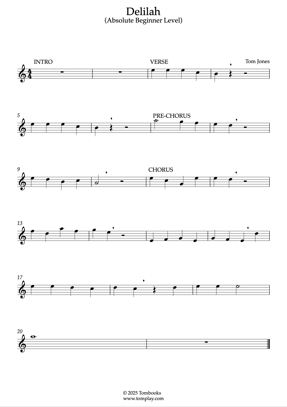 Téléchargez la partition Flûte Delilah (niveau débutant absolu) de Tom Jones. Partition po…