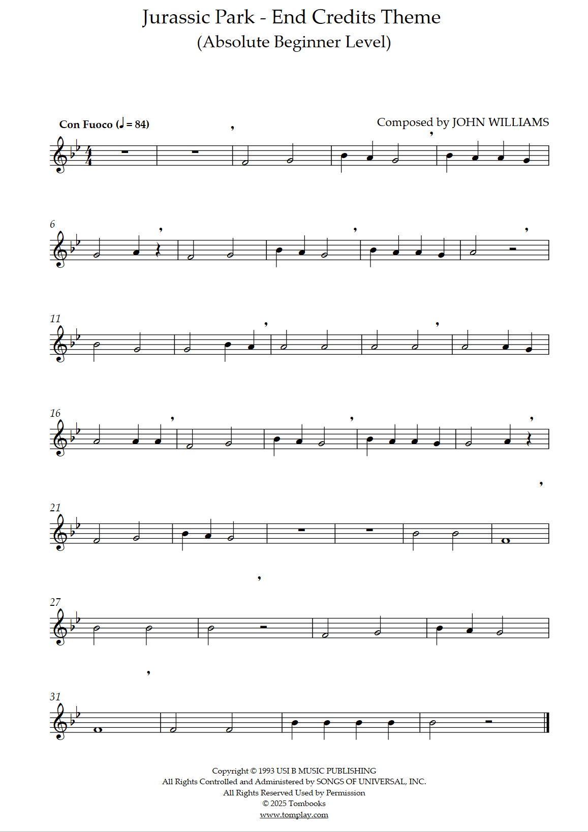John Williams : Jurassic Park - Thème End Credits (niveau débutant absolu)