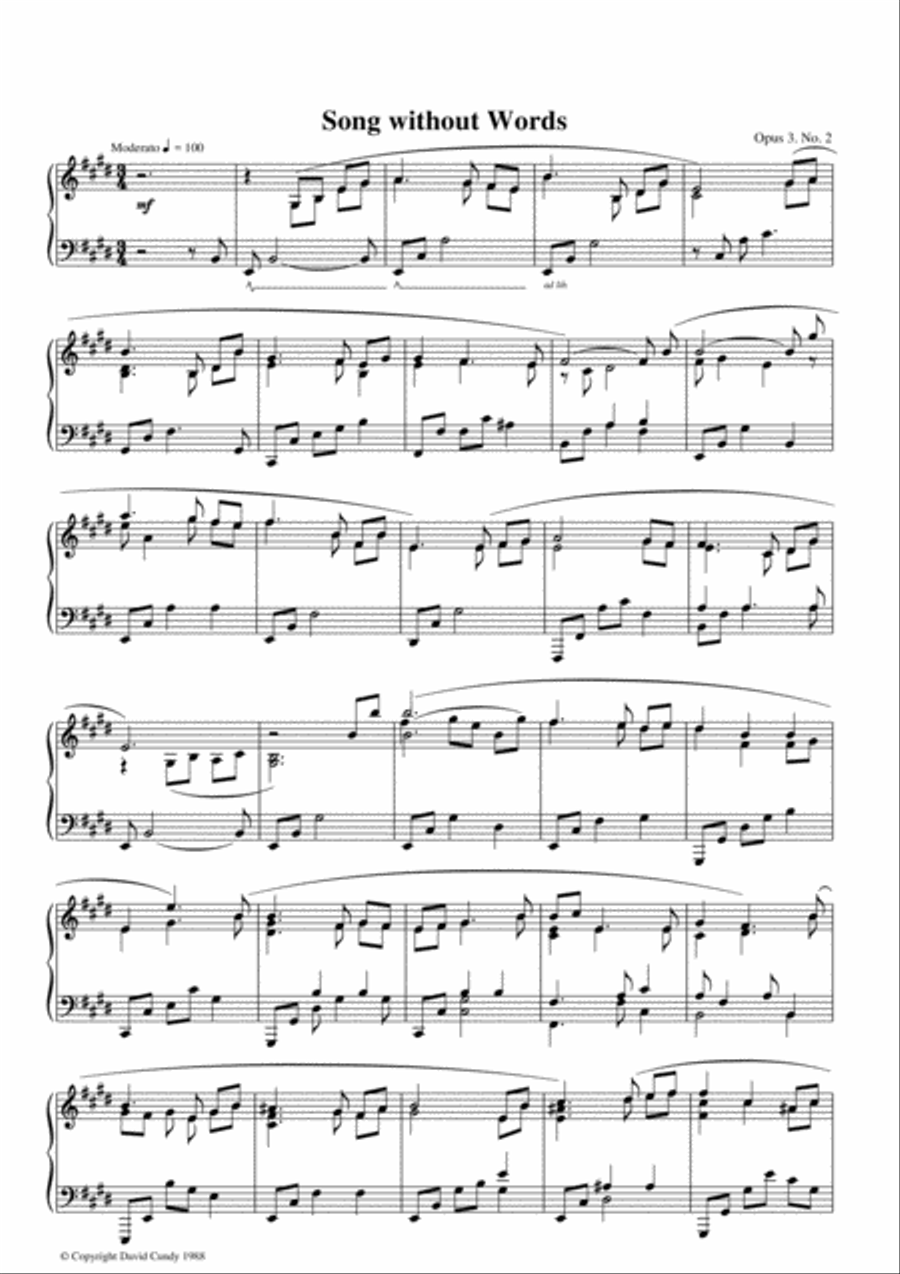 French Horn,Piano - Level 3 - Digital Download SKU: A0.528919 Composed by Felix Mendelsshon. Arranged by Diego Marani. Classical,Instructional,Romantic Period,Standards. Score and part. 7 pages. Diego Marani #6664743. Published by Diego Marani (A0.528919). Songs Without Words (Lieder ohne Worte) is a series of short lyrical piano songs by the Romantic composer Felix Mendelssohn Bartholdy, written between 1829 and 1845.The works were part of the Romantic tradition of writing short lyrical pieces for the piano, although the specific concept of Songs Without Words was new.This arrangement for F Horn with piano accompaniment faithfully reflects the original for piano solo.