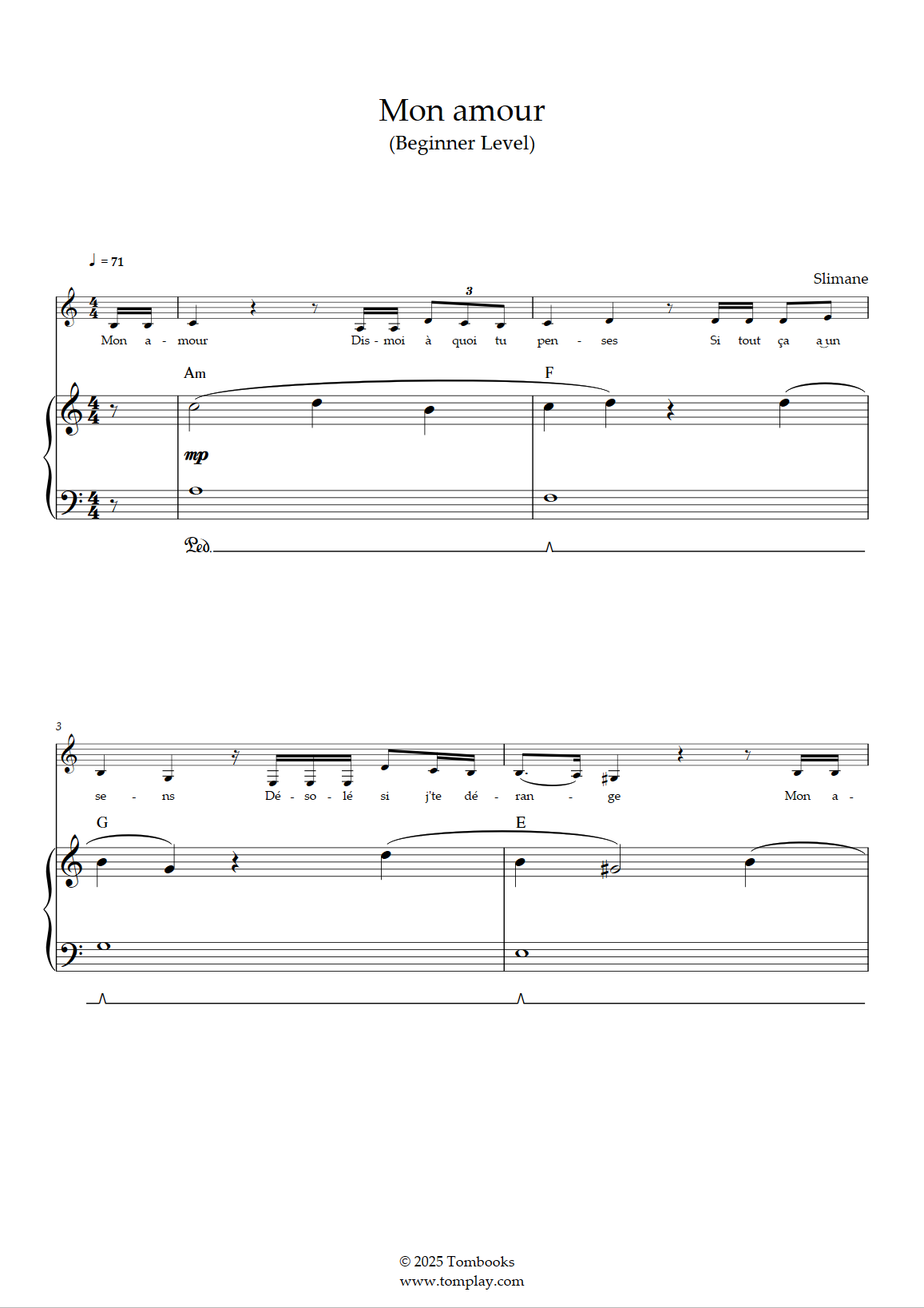 Téléchargez la partition Piano Mon amour (niveau débutant, piano solo) de Slimane. Partiti…