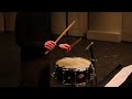 Written for solo snare drum with pre-recorded audio by David Reeves, the drumming vocabulary of this snare solo is nearly devoid of any rudiments. Its technical difficulty lies in the dynamic range and control, and in coordinating with the audio track. The musical meat of this work is created by the contrast between the sharp punctuations and rhythmnicity of the snare part and the more extended sounds and phrases of the pre-recorded instruments, which include taiko, shaker, squeeze drum, gong, and metals. Serving as an effective choice for programming variety, the pre-recorded audio accompaniment is provided in three versions (accompaniment only; accompaniment and metronome click; and metronome click only) to allow for practice and performance options.
