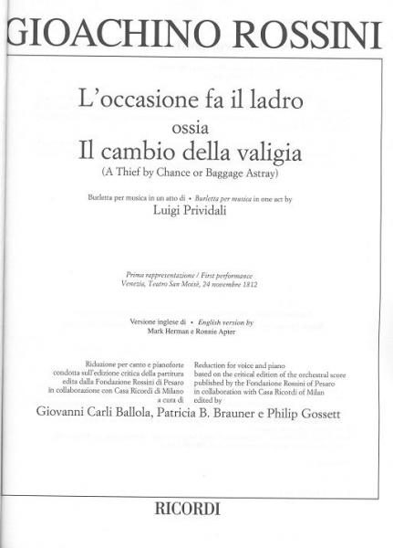 | Rossini G. - L'occasione Fa Il Ladro Ossia Il Cambio Della Valigia - Chant Et Piano Piano, Voice [Sheet music] Ricordi