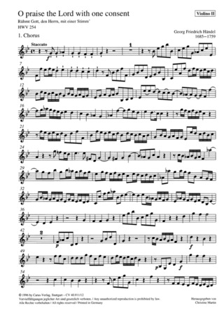 Anthem. Par HAENDEL GEORG FRIEDRICH. As in many of his other works, Handel drew upon earlier compositions of his own for 'O praise the Lord with one consent'. The arias in this anthem are brief and straightforward by comparison with the arias in Handel's Italian operas./ Répertoire / Solo ST (T) B, Choeur SATB, Hautbois, 2 Violons et