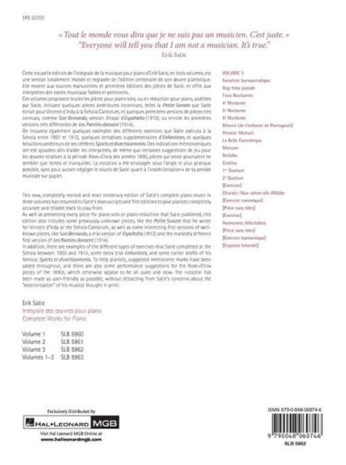 | Intégrale Des Oeuvres Pour Piano Vol.3 (SATIE ERIK) Piano seul Salabert