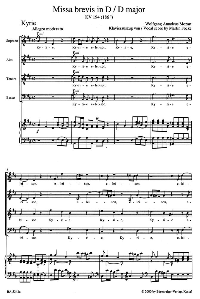 Mozart W.a. - Missa Brevis In D Major Kv 194 - Reduction Chant, Piano