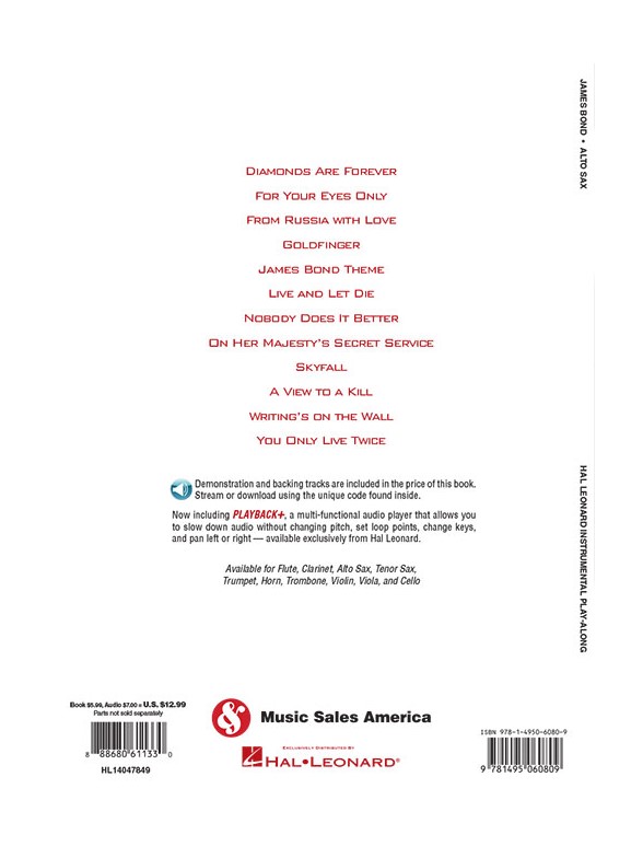 Alto Saxophone. This volume in the Hal Leonard Instrumental Play-Along series contains 12 themes from the James Bond films in arrangements for solo Alto Saxophone. A downloadable backing track is included for each piece so you can play along and sound like a pro!