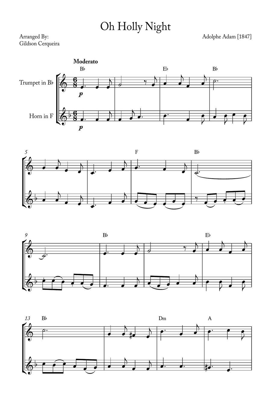 B-Flat Trumpet,Horn,Instrumental Duet - Level 2 - Digital Download SKU: A0.1516472 Composed by Adolphe-Charles Adam. Arranged by Gildson Cerqueira. Christmas,Classical,Holiday,Pop,Sacred. 7 pages. Gildson Cerqueira #1090638. Published by Gildson Cerqueira (A0.1516472). Capture the true spirit of the season with our exclusive arrangements of the timeless classic, O Holy Night. Whether you’re looking for a beautiful choral rendition or a stunning instrumental version, our professionally crafted arrangements are designed to inspire and captivate audiences of all ages. Perfect for church services, holiday concerts, or festive gatherings, these arrangements bring a fresh, sophisticated touch to one of the most beloved Christmas songs of all time.Don’t miss the chance to make this season unforgettable—get your copies today and let the music of O Holy Night shine like never before![VERSIONS WITH OR WITHOUR CHORDS AVAILABLE!].