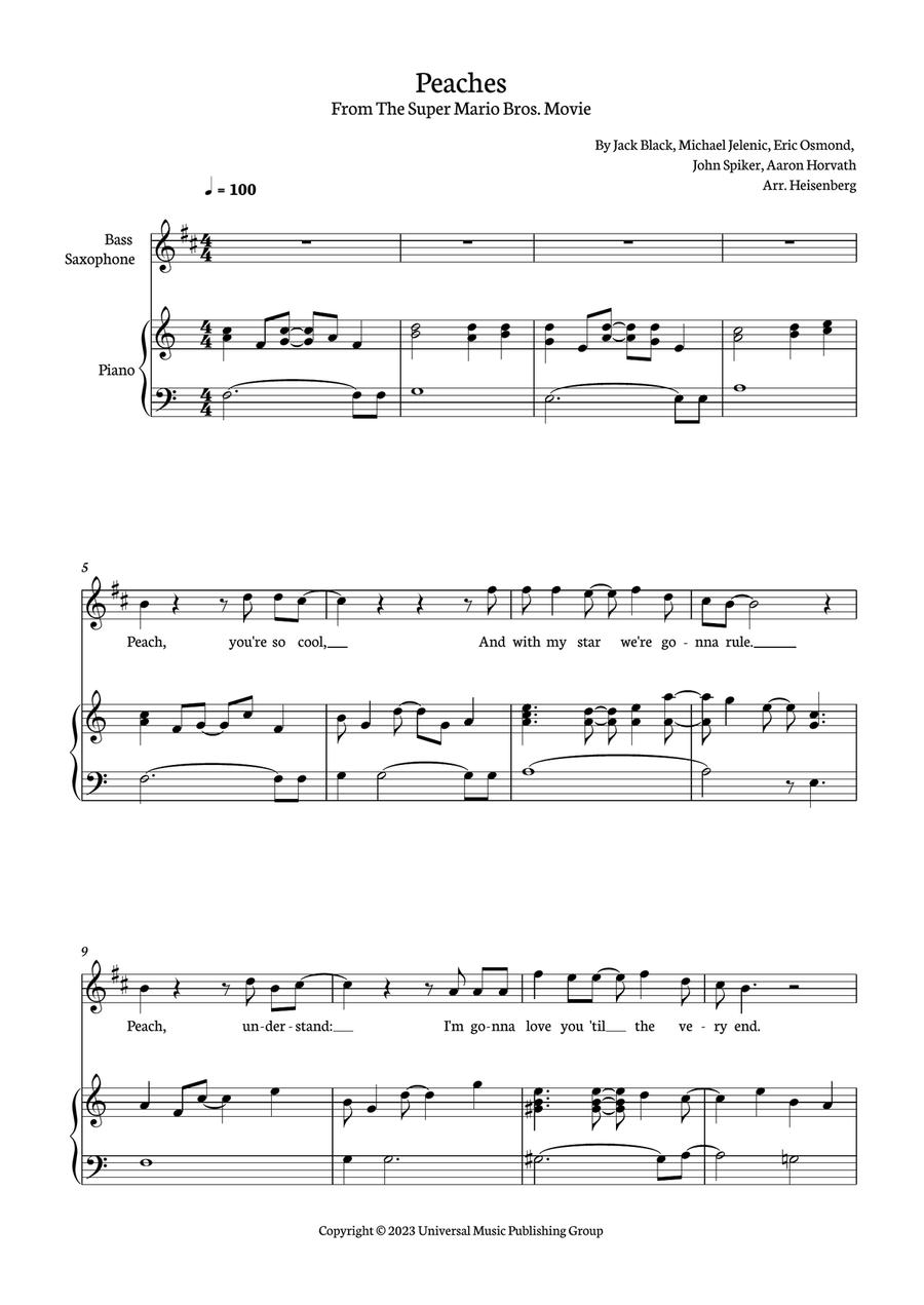Bass Saxophone,Instrumental Solo,Piano - Level 3 - Digital Download SKU: A0.1219057 By Jack Black. By Aaron Horvath, Eric Osmond, Jack Black, John Spiker, and Michael Jelenic. Arranged by Heisenberg. Children,Film/TV,Pop,Singer/Songwriter,Video Game. Score and individual part. 5 pages. Heisenberg #815476. Published by Heisenberg (A0.1219057). Peaches from Super Mario Bros. Movie for Bass sax solo with piano. Score and parts included.